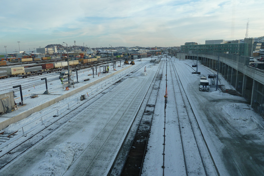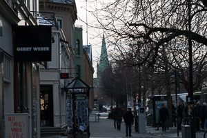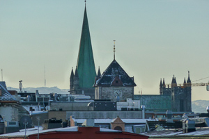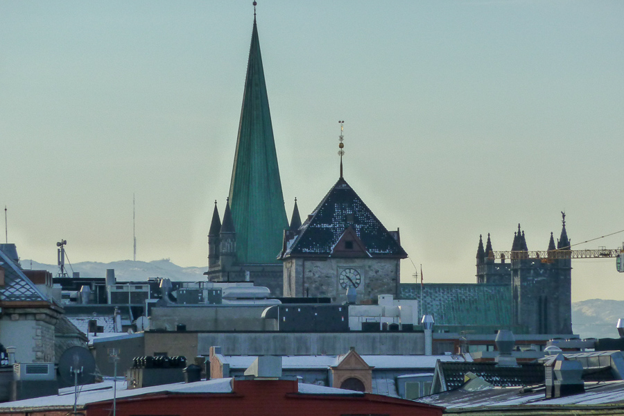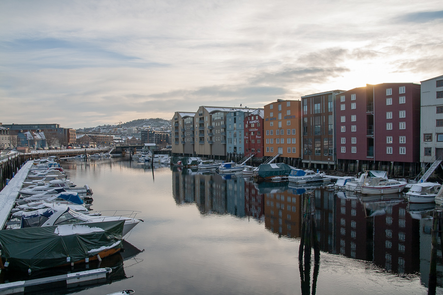 Nach einem Frühstück, das überwiegend aus Fisch bestand (so gewollt, ich liebe Fisch zum Frühstück), sollte es also mal wieder an Land gehen. Obwohl Trondheim die drittgrößte Stadt Norwegens ist, parken die Schiffe fast im Stadtzentrum. Fußweg knapp 1 km! Da bin ich schnell drin, kann mir die Kathedrale ansehen, habe schnell ein paar Fotos gemacht und bin ebenso schnell wieder auf dem Schiff. Dachte ich. Da hab ich die Rechnung aber ohne die Norweger gemacht. Was ich in dem „Dorf“ Ålesund noch als Ausnahme ansah, entpuppt sich in Trondheim als norwegischer Alltag: Die Gehwege werden nicht geräumt. Wenn man Glück hat, wird spärlich Granulat eingesetzt. So entpuppt sich der eigentlich kurze Marsch als Spießrutenlauf, denn im Lande des langen Frostes entwickelt sich der Schnee auf dem Gehweg schnell in eine eisige Buckelpiste. In der Folge sind die Bilder aus Trondheim eher spärlich, da ich aus Angst um meinen lädierten Rücken den Landgang doch etwas abkürzen musste.