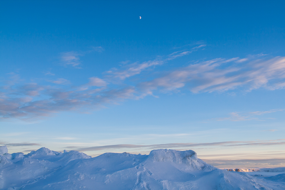 An der Kugel wird dann ohne Rücksicht auf Licht und Leute geknipst, was das Zeug hält. Kinder vor Kugel, Omma vor Kugel, Vatta und Mutta vor Kugel, Kugelbauch vor Kugel. Wenn ihr euch also wundert, warum der Sockel auf meinen Fotos nicht zu sehen ist: Mich interessierte NUR die Kugel. Dafür habe ich mir dann eine Perspektive ausgesucht und auf das richtige Licht gewartet, denn die tief stehende Sonne kam immer wieder hinter den Wolken hervor und der blasse Halbmond konnte auch noch eingearbeitet werden (Suchbild). Überaupt war das Licht, wenn denn die Sonne hervorkam, unglaublich warm und verzaubernd. Der blaue Himmel, teils schon mit sichtbaren Sternen, dazu der Schnee und das warme Licht der sehr tief stehenden Sonne, amazing!