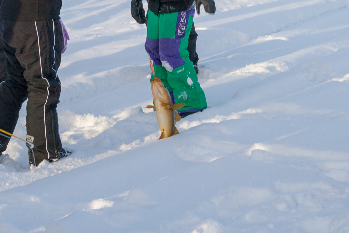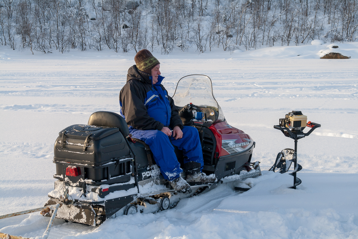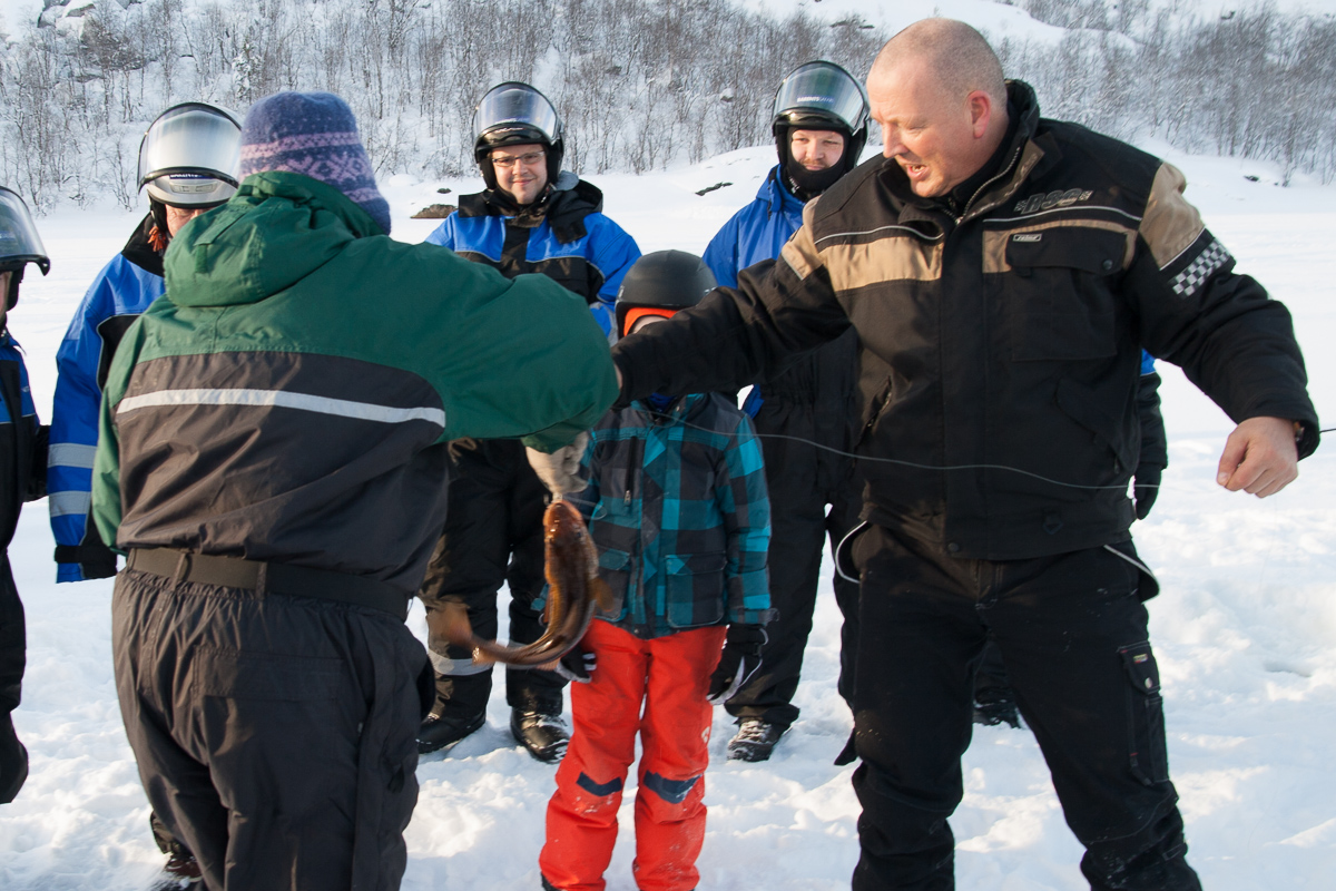 Am Ende des Fjords stießen wir auf eine norwegische Fischerfamilie, die dort nach ihrer Tagesration Fisch angelte. Eisangeln in Reinkultur. Die beiden alten saßen auf ihren Schneescootern (das übliche Fortbewegungsmittel in der Natur hier) und ließen die Kinder angeln. Einiges hatten sie schon rausgezogen. Ulf musste es natürlich auch einmal veruchen. Er erzählte, dass die Fische besser beißen, wenn der Angler singt. Das scheinbar unvermeidliche geschah: Ulf sang. Der Fisch fand es wohl so schlecht, dass er den Köder einfach vom Haken gefressen hatte, natürlich ohne anzubeißen. Erst der zweite Versuch brachte dann den ersehnten Erfolg! Zwischenzeitlich hatten die Fischerskinder schon reichlich Beute gemacht. In fünf Minuten haben drei große Fische angebissen. Eine wirklich ordentliche Mahlzeit, für die man bei uns viel Geld hinlegen müsste.