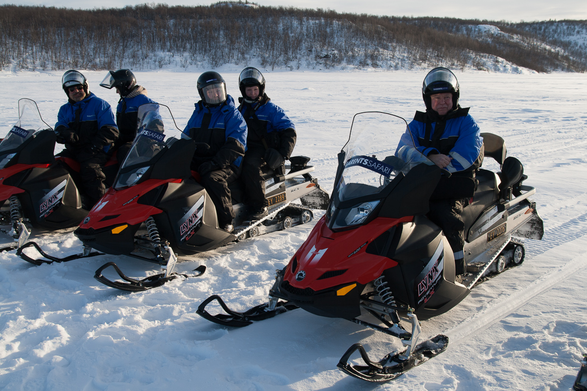 Dann hieß es, Schneemobil fassen und los fahren. Es ging zuerst einmal ganz langsam in Richtung zugefrorenen Fjord, über diverse kleine Hügel und vorbei an drei kargen Bäumchen. Für unerfahrene Fahrer wie mich durchaus ernst zu nehmende Hindernisse. So ein Schneescooter hat schon ein eigenwilliges Fahrverhalten. Auf dem Fjord dann Gas geben. Spitz 30 km/h. Mehr war nicht erlaubt. Das Gerät und ich kamen ganz gut miteinander aus und ich hatte auch noch das Glück, ein Gefährt ganz für mich alleine zu haben, so fiel mir vor allem das Einhalten der dritten Regel schon auf der ersten Etappe nicht wirklich schwer. Die war übrigens etwa 10-15 Minuten lang. Dann hieß es nach kurzem Stop: Richtig Gas geben. Nicht mehr als 60 km/h zwar (Tacho geht bis 160!), aber es durfte auch überholt werden. Yeah! Das macht Spaß! Vor allem das Verlassen der ausgefahrenen Spur und ab durch den unberührten Schnee! So richtig was für Jungs! Wobei – auch die Mädels hatten ihren Spaß!