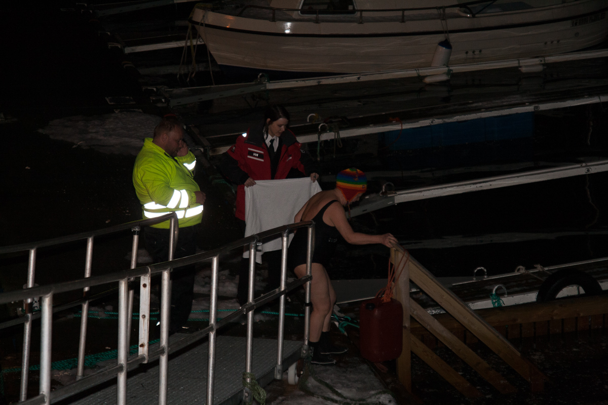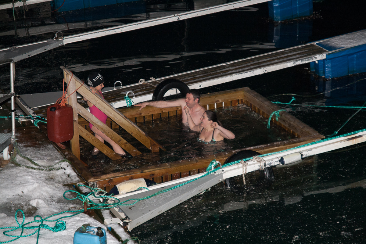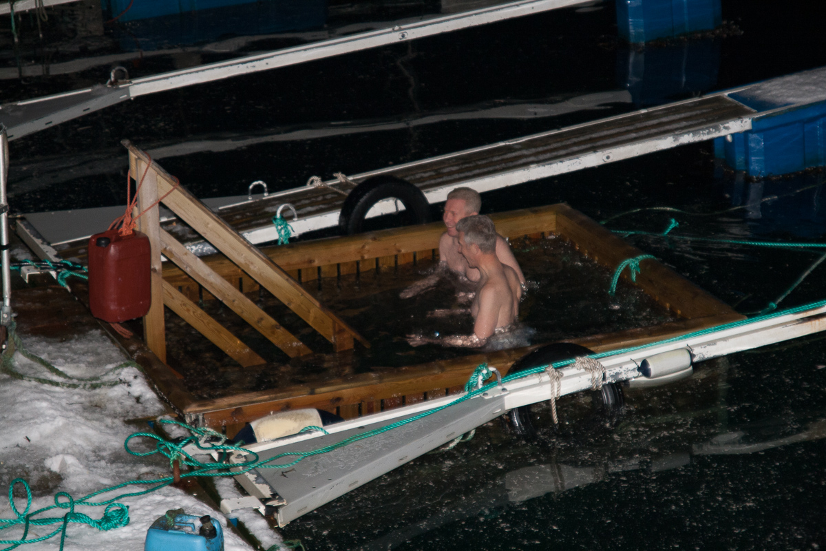 Ein kleines Intermezzo gab es bei einem Zwisachenstop in Vardø. Einige mutige Freiwillige haben sich zu einem Eisbad im Hafenbecken gemeldet. Ich hab mir den Spaß gemacht, sie beim Eisgang zu fotografieren. Diese Bilder und einige weitere hier: