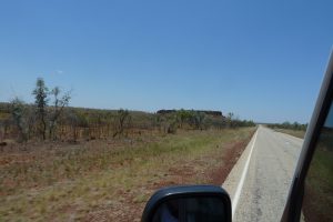 Die letzten ca. 380 km auf dem Stewart Highway lagen vor uns. So langsam begannen wir uns zu fragen, wann denn die Wüste als solche eigentlich zum Vorschein kommt? Gut, das Gelände wurde übersichtlicher, da es immer weniger Bäume, dafür immer mehr niedrige Büsche gab. Aber alles in allem blieb es doch sehr grün. Hat sehr wahrscheinlich mit der Jahreszeit zu tun, denn hier ist jetzt rein theoretisch Frühling. Rein theoretisch deshalb, weil mich ein Schild an einem Rastplatz über die jahreszeitlichen Verhältnisse aufgeklärt hat. Darauf heißt es: For the peaople who live in central Australia, the four season spring, summer, autumn and winter are more alien concepts … Das sagt ja wohl alles. Regen fällt hier nicht viel und wenn, dann heftig. Ansonsten ist es tagsüber warm (Winter) bis heiß (Sommer) und nachts kühlt es gut ab. Und trotzdem ist es recht grün hier. Eine nicht unerhebliche Biomasse, über deren Fortbestehen in der fernen Zukunft immer wieder unsere Gedanken kreisten. Dazu hatten wir noch das Glück, in einen dieser für Zentralaustralien so seltenen Regengüsse zu kommen. Schon von weitem, so ca. 60 km vorher, sahen wir das Wolkenband, aus dem der Regen niederging. Nach vielen Kurven, die uns erst weg, dann aber immer näher an die gesichtete Niederschlagszone brachten, viel schlagartig die Temperatur von 32°C auf 24°C und es wurde tatsächlich ordentlich nass.