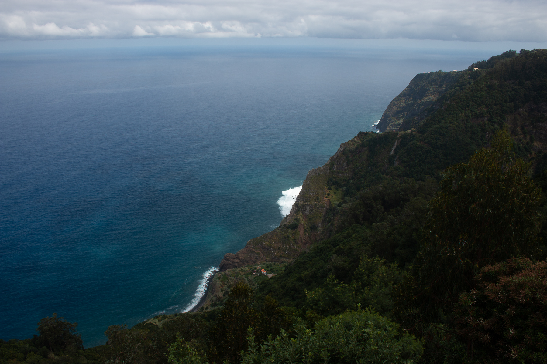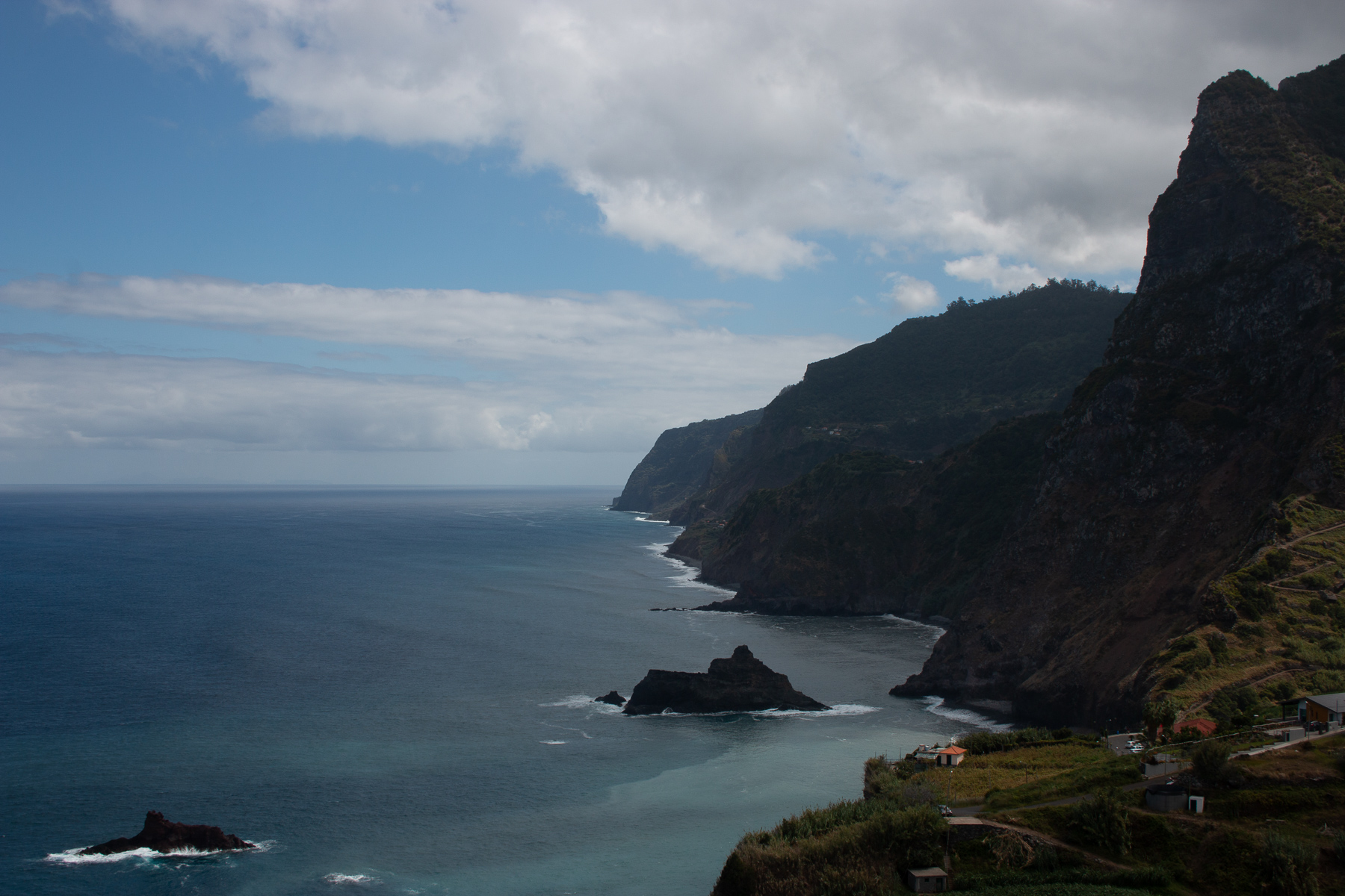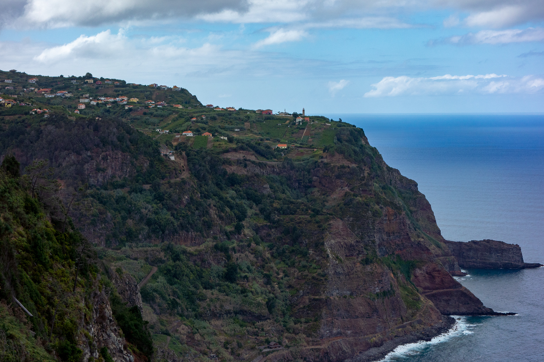 Nachdem ich meine Fotos gemacht hatte, ging es weiter zum Hotel Quinta do Furão. Hinter diesem Hotel startet der Küstenwanderweg nach São Jorge. Ihn zu finden war nicht schwer. Ihm zu folgen schon. Natürlich gibt es keine Wegmarkierungen und der Weg ist auch kein Weg, sondern eher ein Trampelpfad. Erst ging es noch eindeutig voran, vorbei an Gemüsefeldern und unter Weinreben hindurch mit immer wieder sehenswerten Ausblicken auf die Küste und das gebirgige Hinterland. Immerhin bewegten wir uns auf einer Höhe von fast 500 Metern über NN.