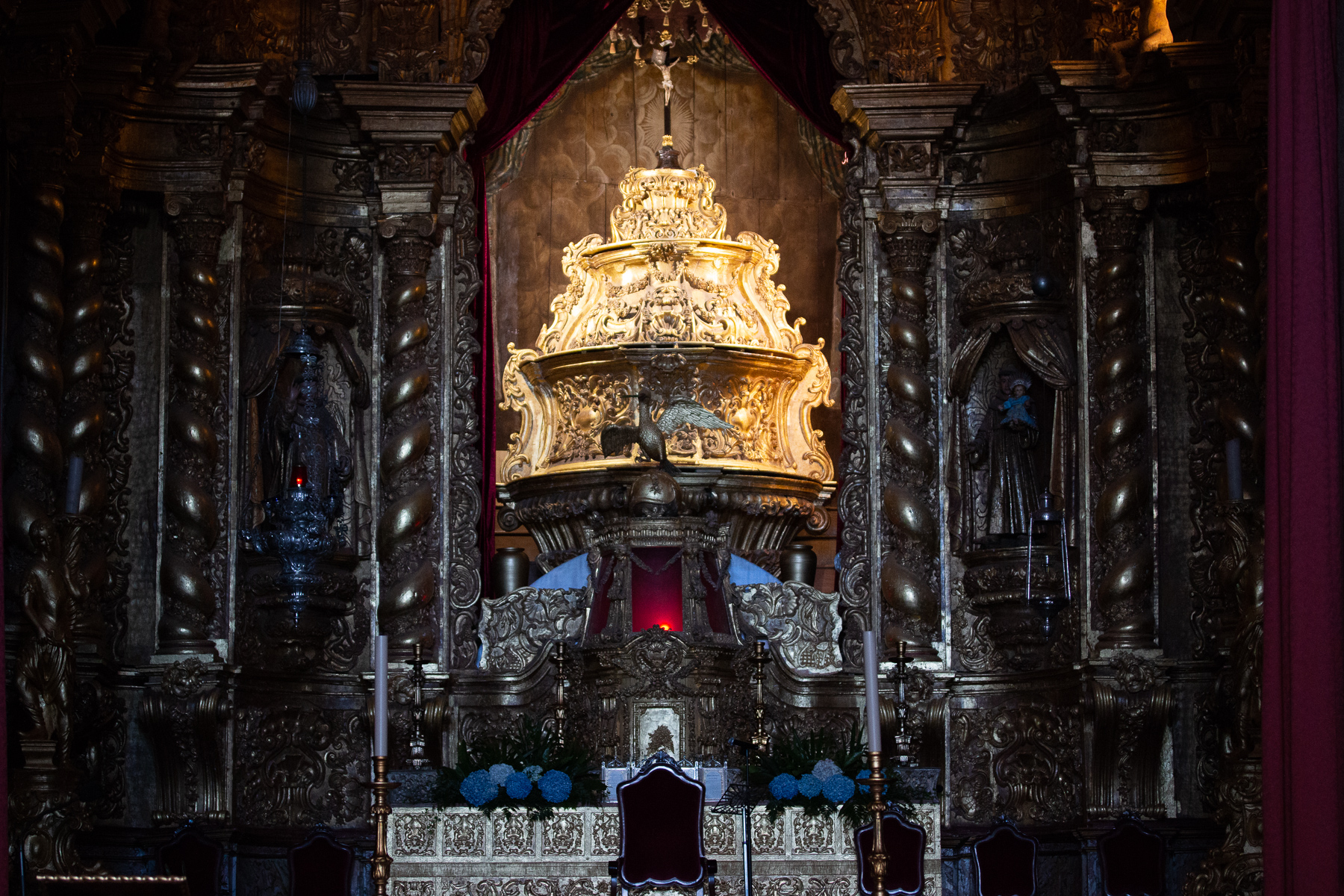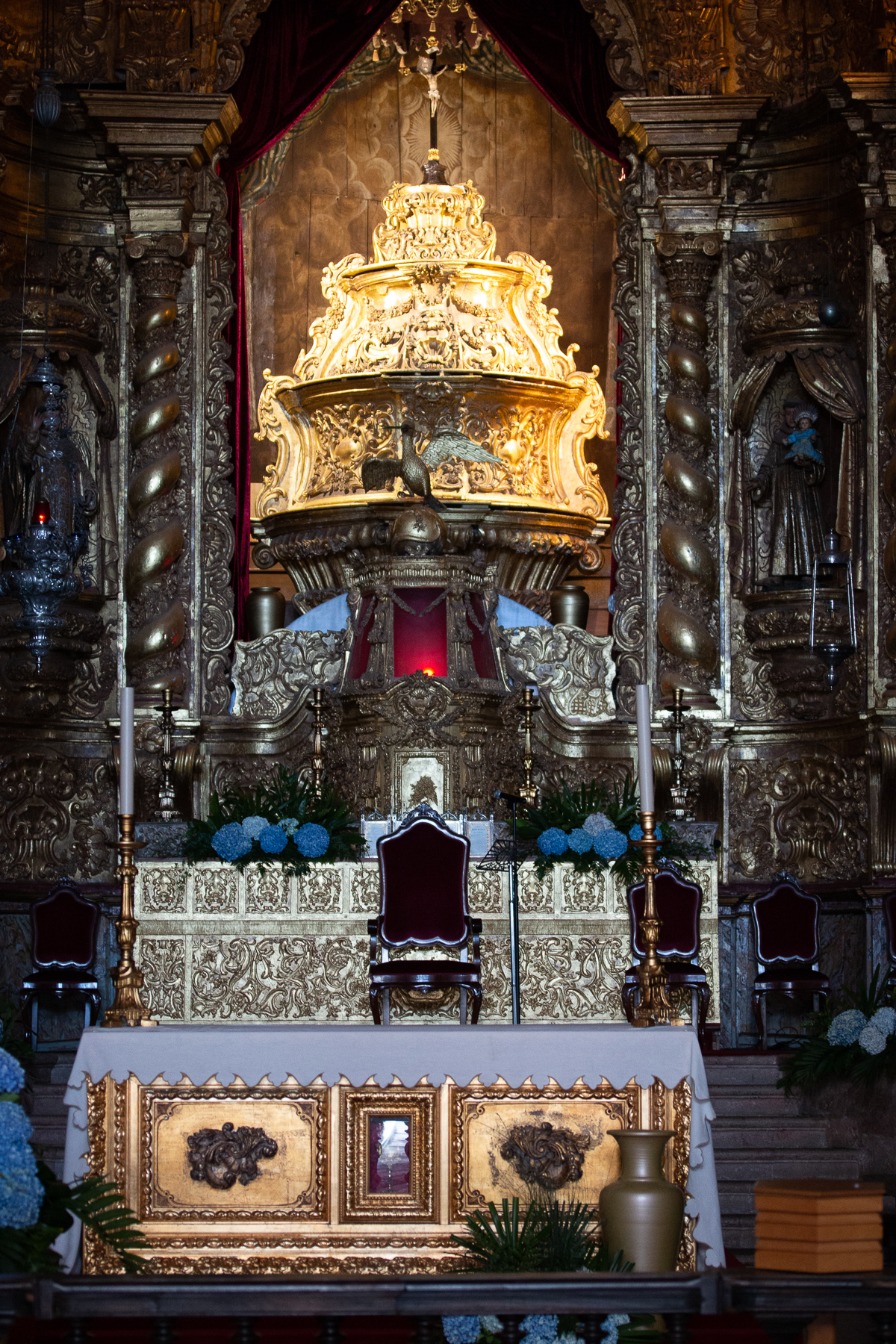 So sind wir dann mit dem Auto nach São Jorge, denn dort gibt es eine Kirche mit vergoldeten Barockschnitzereien. Sie gilt als die schönste und kunsthistorisch wertvollste Kirche des Nordens von Madeira. Da wir kurz vor Beginn des Abendgottesdienstes dort ankamen und die Kirche sich schon langsam mit Gläubigen füllte, habe ich nur wenige Aufnahmen ohne Blitz gemacht, um niemanden in seiner Andacht zu stören. Das Ergebnis wieder weiter unten.