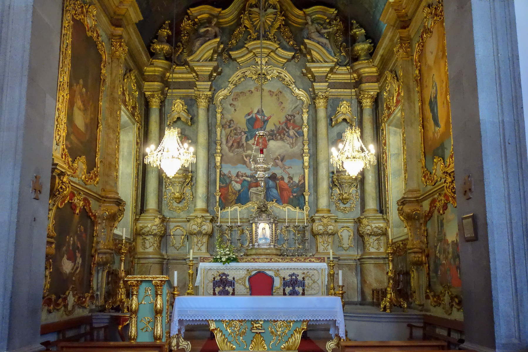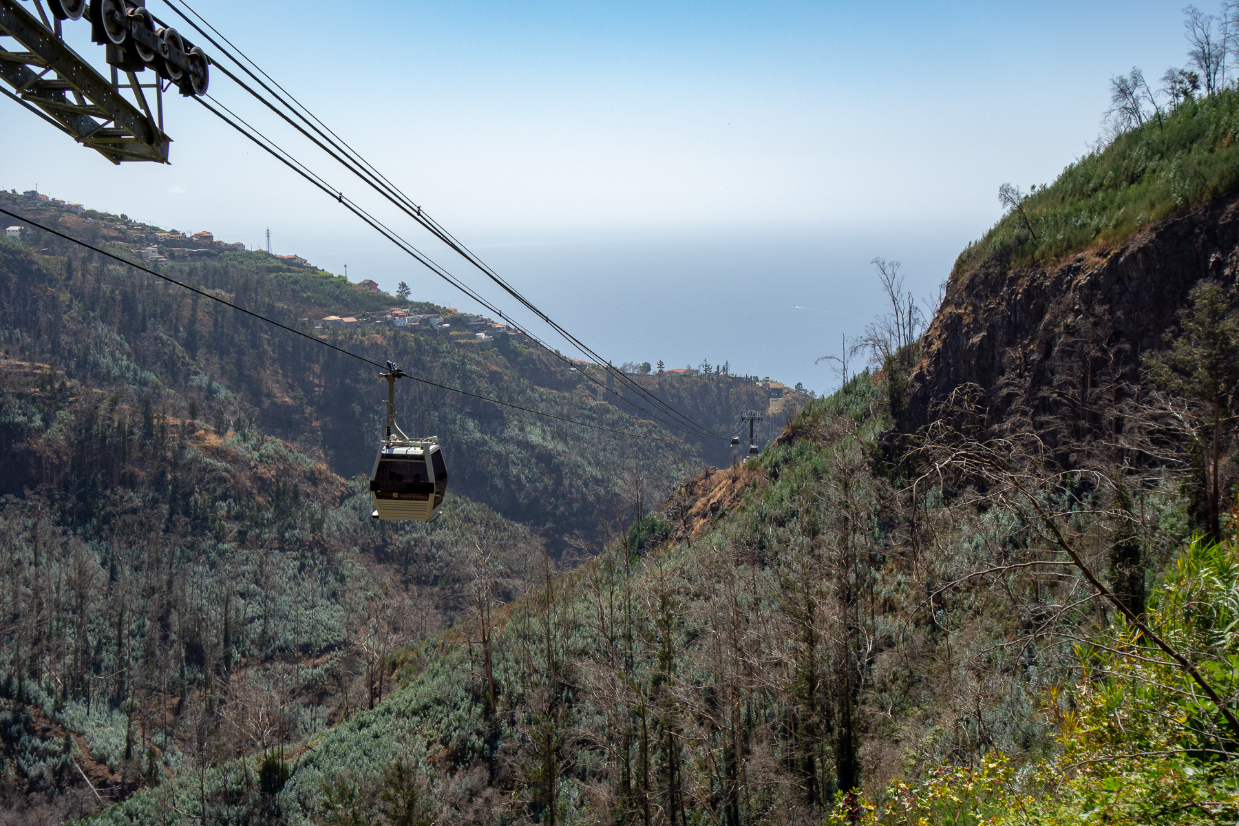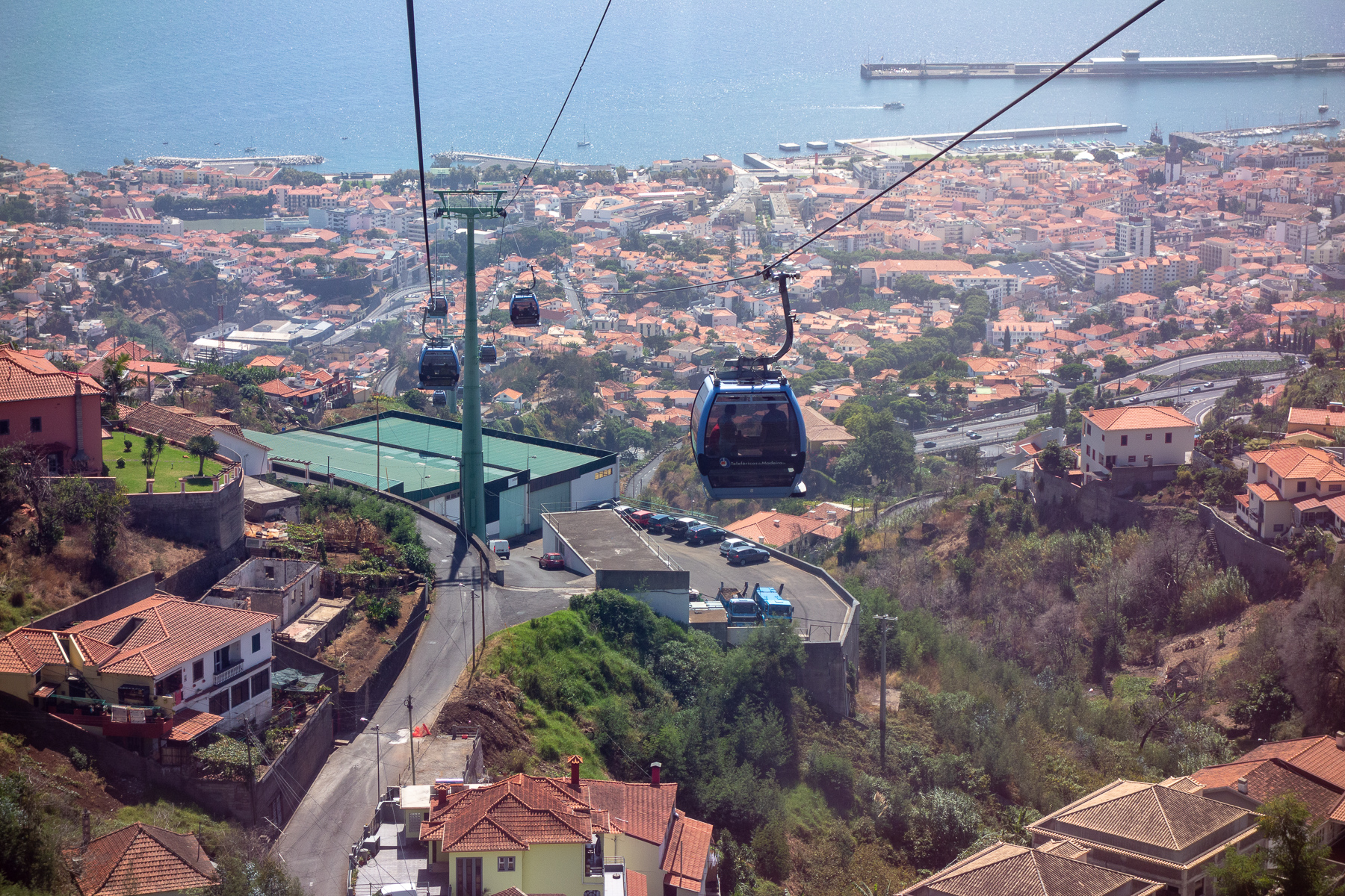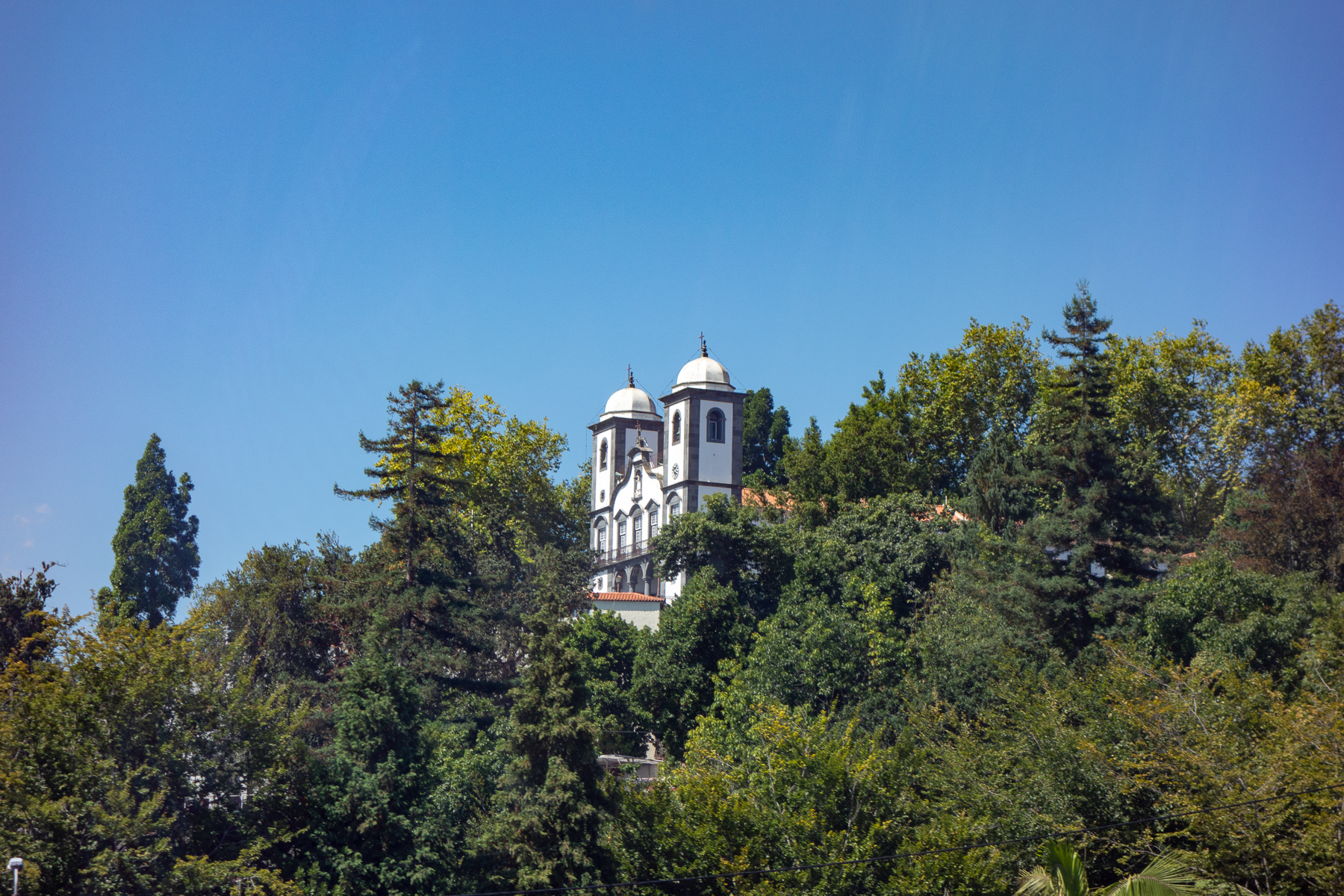 Vom Parkhaus aus (gibt es so etwas im Norden überhaupt?) war es nur der Weg über die Straße, um zur Seilbahn zu gelangen. Diese sollte uns einen Blick über das in eine Bucht an den Hang gebaute Funchal erlauben. Also sind wir rüber, haben uns zwei Tickets gekauft (16€ / Person) und sind schnurstracks am Seil den Berg hinauf. Oben wartet ein tropischer Garten auf die reichlich vorhandenen Ankömmlinge, der allerdings hauptsächlich aus einem Restaurant zu bestehen schien. Eine von Monte ausgehende weitere Seilbahn zum botanischen Garten ließen wir ebenso wie den tropischen Garten links liegen, da beides für heute nicht auf dem Plan stand. Doch ein Blick in die Wallfahrtskirche Nossa Senhora do Monto, in der seinerzeit Österreichs letzter Kaiser beigestzt wurde, musste sein. Im innern herrscht ein ähnlich pompöser Barrock wie in der Kiche von São Jorge vor. Allerdings unter deutlich weniger Verwendung von Blattgold.