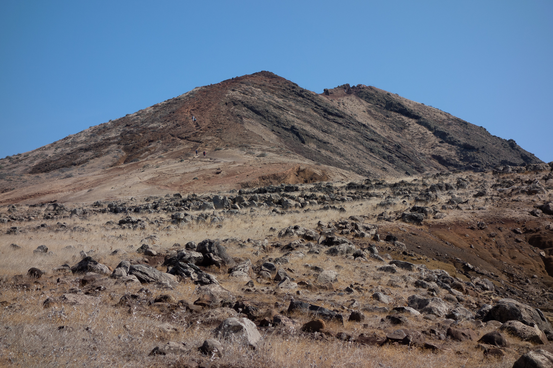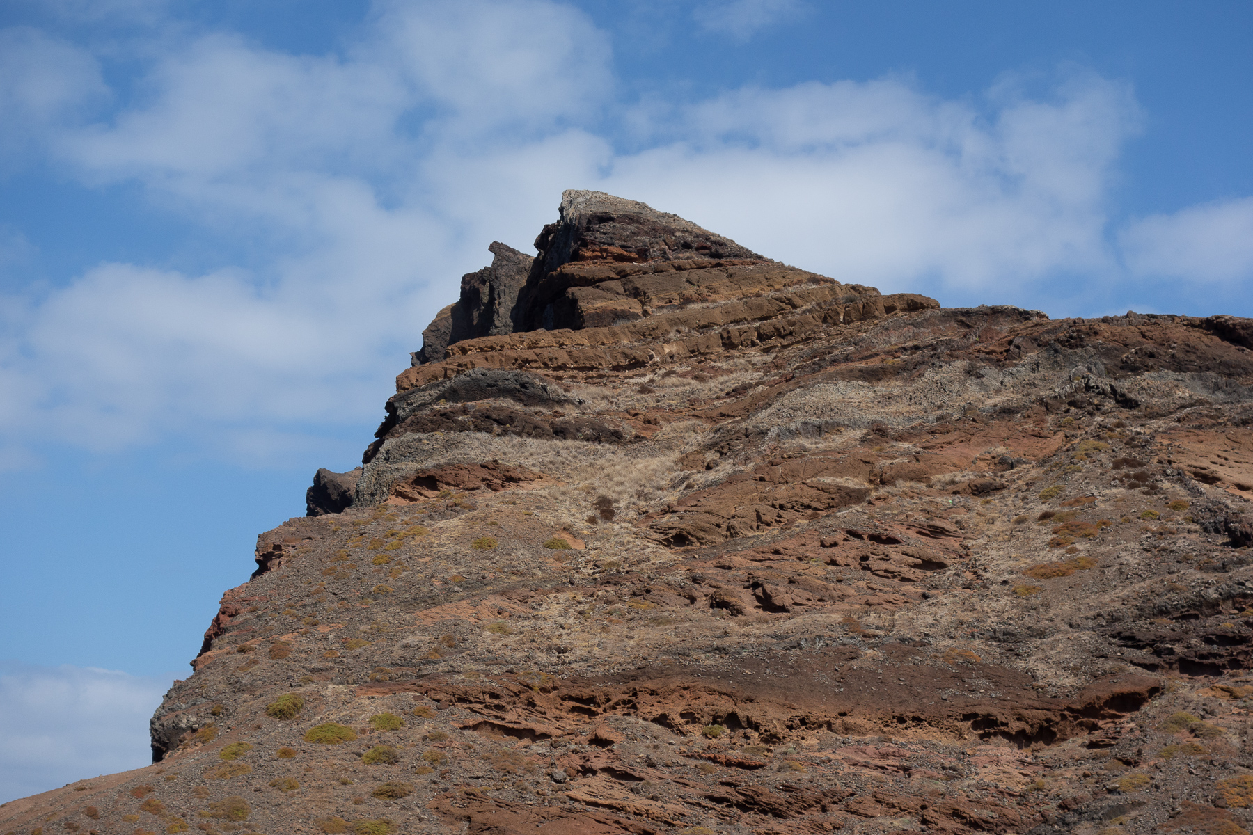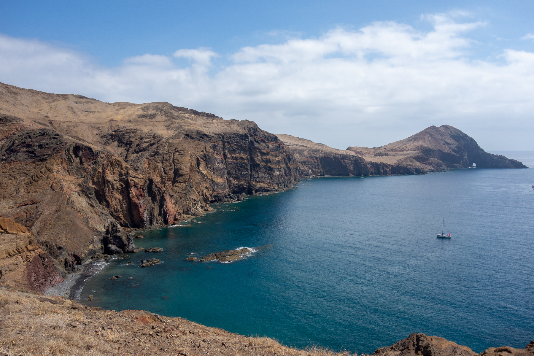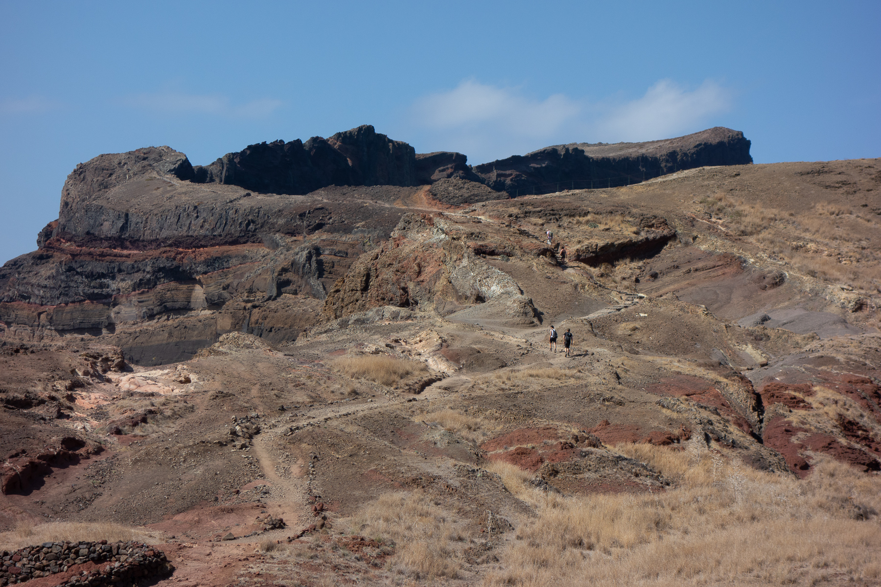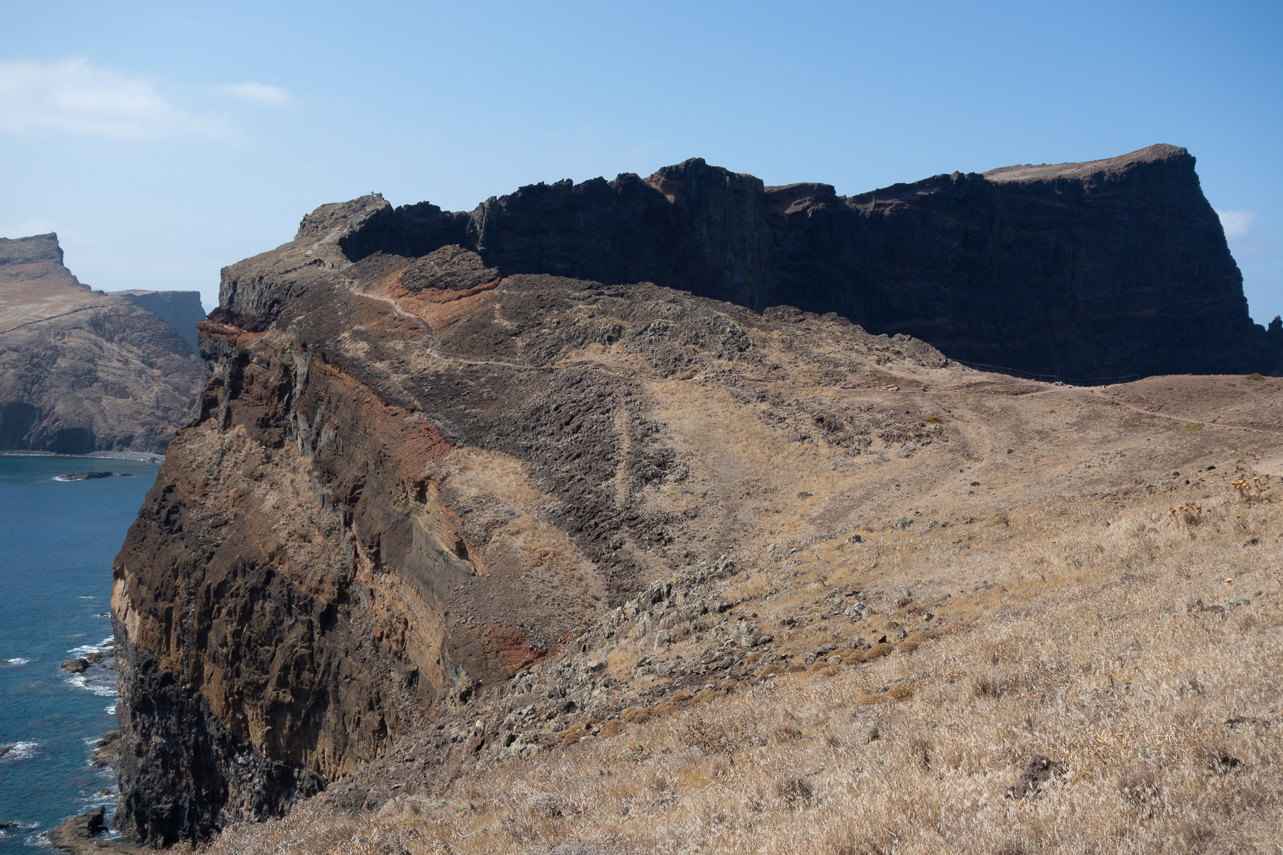 Je weiter wir nach Osten kamen, desto deutlicher wurde das, was der Reiseführer versprochen hatte. Die Berge wurden flacher (was man so flach nennt auf Madeira) und die Vegetation spärlicher. Auf dem Weg zum Parkplatz am Ende der östlichsten Straße verschwand die Vegetation fast gänzlich. Nur noch Gräser und am Straßenrand gepflanzte Palmen zierten das Bild. Von den Palmen einmal abgesehen hielte die Landschaft einen Vergleich mit dem Norden Irlands stand. Na vielleicht nicht ganz - Nordirlands Gras ist grüner. Eher so ein Zwischending aus Nordirland und australischem Red Center, denn der Sand hier ist auch rötlich bis braun.