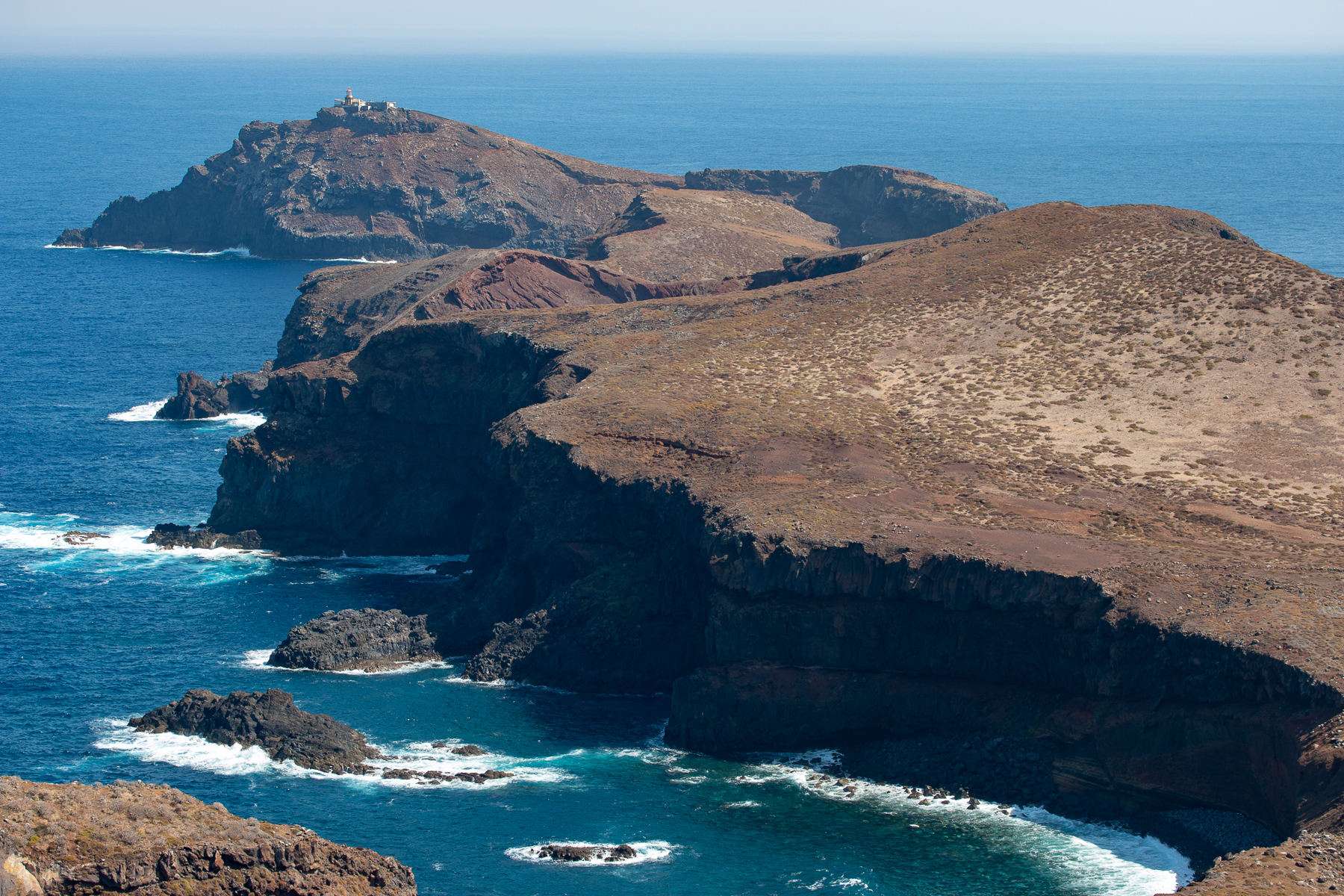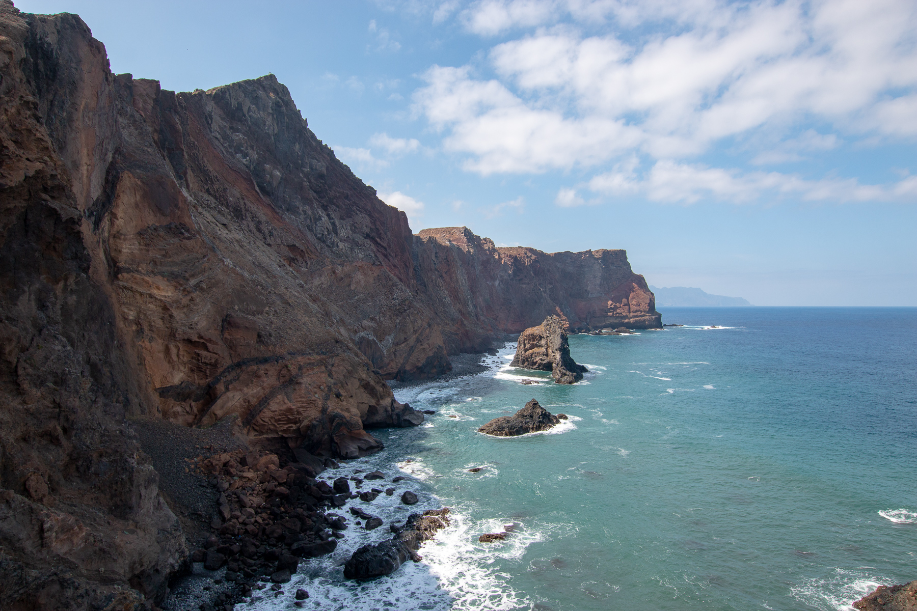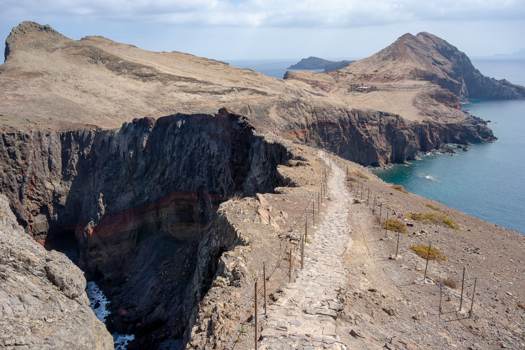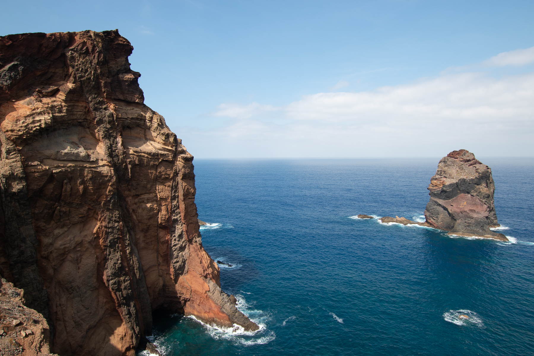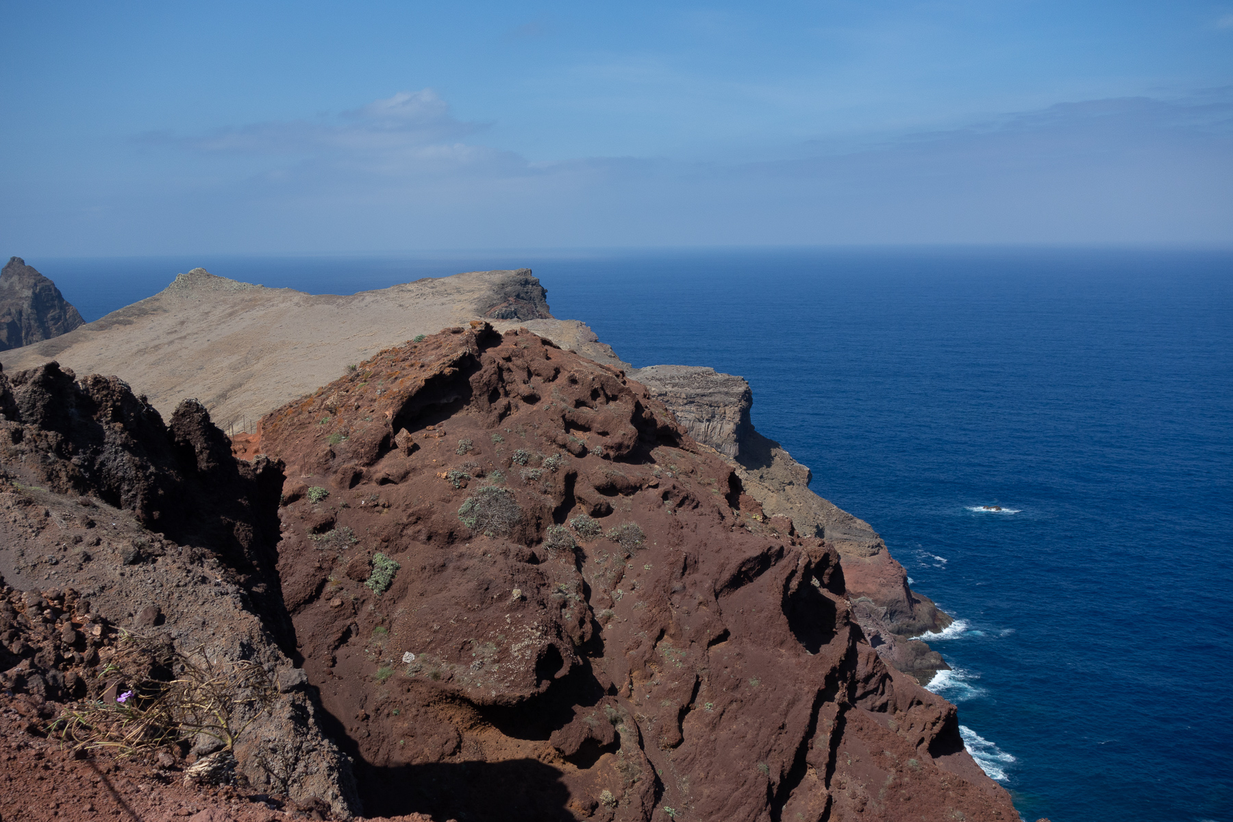 Auf dem Weg zum Ende der Halbinsel, dass durch den Pico do Furado, einem kleinen Hügel von 150 Metern Höhe definiert ist, ging es bergauf bergab von einem Aussichtspunkt zum nächsten. Auf der Nordseite der wilde Teil des Antlantik, wo Wellen und Wind ungehindert auf die Küste treffen. Auf der Südseite der ruhige Atlantik, der im Wellen-Lee der Insel liegt und zum Baden und Tauchen einlädt. Das schöne an diesem Weg ist, dass man die beiden so unterschiedlichen Seiten gleichzeitig sehen kann, denn die Halbinsel wird teilweise recht schmal.