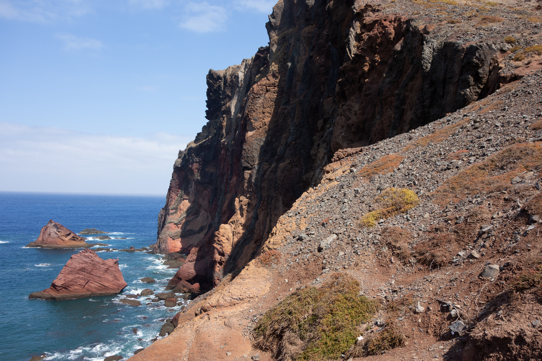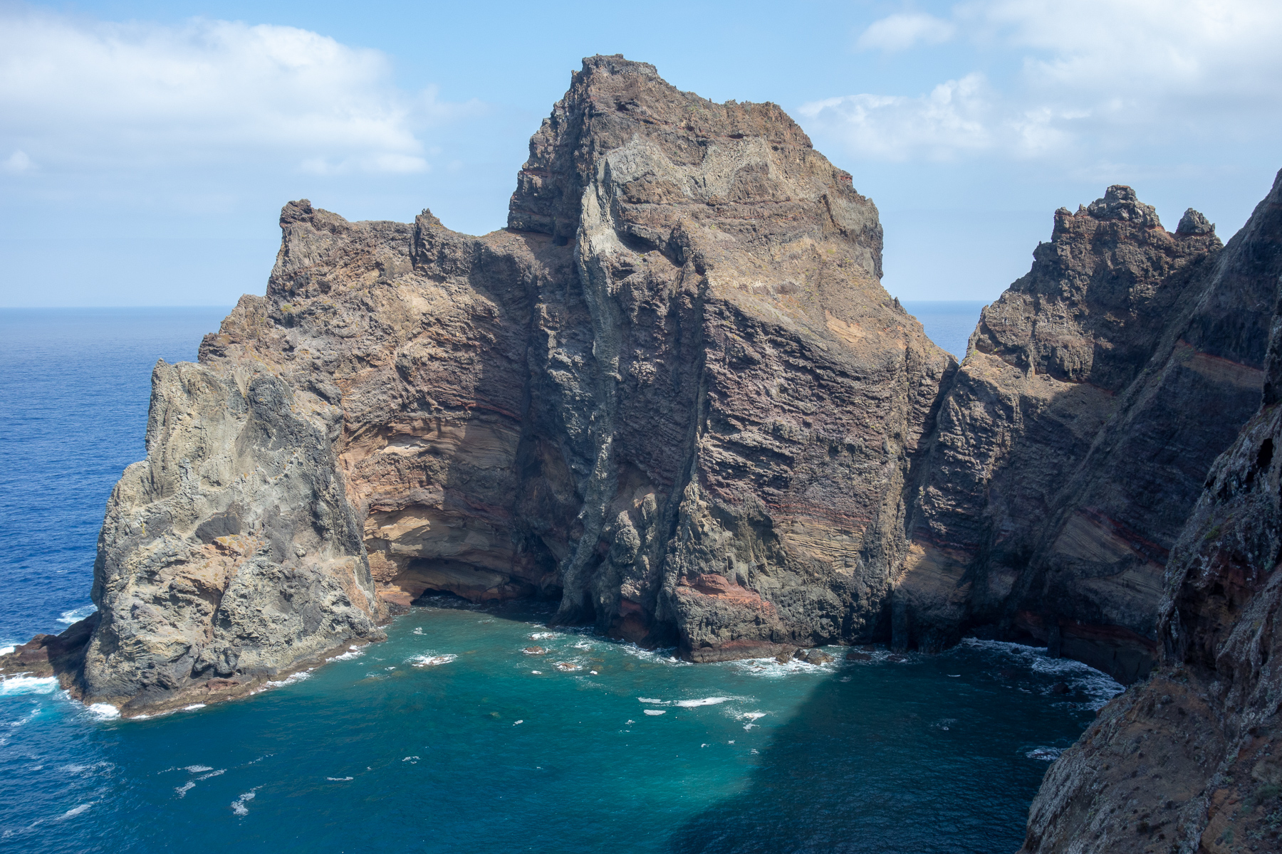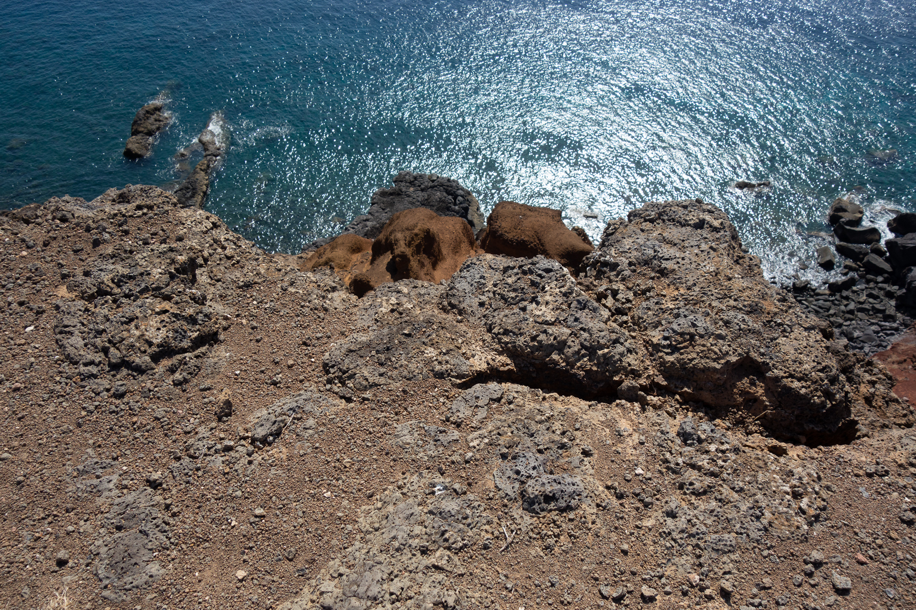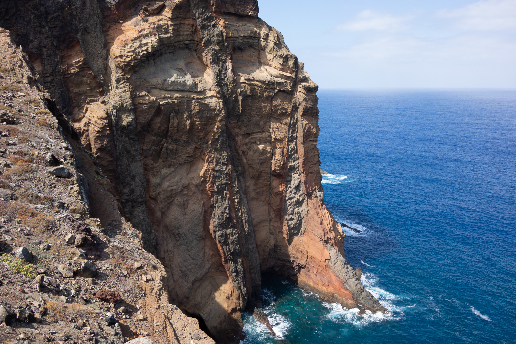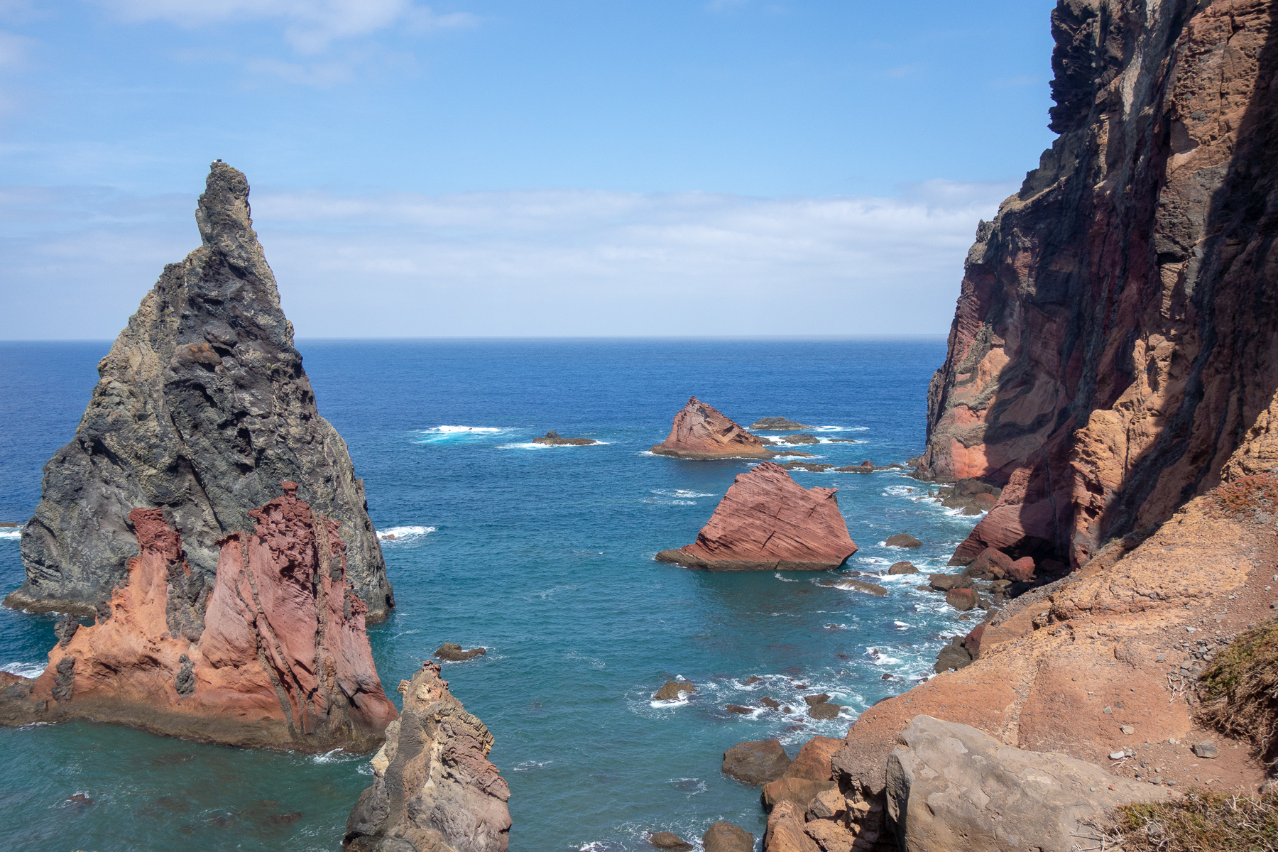 Auf dem Weg zum Ende der Halbinsel, dass durch den Pico do Furado, einem kleinen Hügel von 150 Metern Höhe definiert ist, ging es bergauf bergab von einem Aussichtspunkt zum nächsten. Auf der Nordseite der wilde Teil des Antlantik, wo Wellen und Wind ungehindert auf die Küste treffen. Auf der Südseite der ruhige Atlantik, der im Wellen-Lee der Insel liegt und zum Baden und Tauchen einlädt. Das schöne an diesem Weg ist, dass man die beiden so unterschiedlichen Seiten gleichzeitig sehen kann, denn die Halbinsel wird teilweise recht schmal.