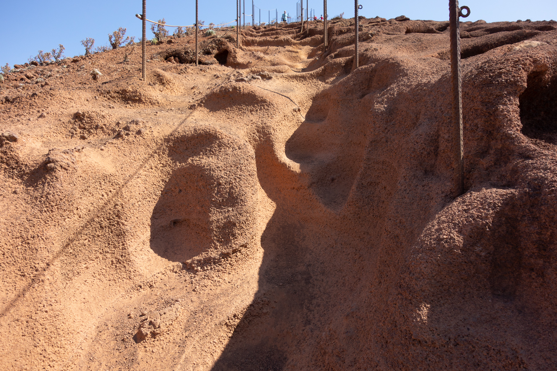 Also bin ich mit einem etwas mulmigen Gefühl weiter, während meine bessere Hälfte den Rückweg antrat. Zuerst hieß es, den Grat vollends zu überqueren und dann durch eine Ebene hindurch den kurzen und steilen Anstieg zum Pico do Fuardo in Angriff nehmen. War die Ebene nach der bisher zurückgelegten Strecke noch Erholung pur, war der Aufstieg das genaue Gegenteil. Kurz und steil trifft es recht gut, wenn man berücksichtigt, dass kurz auch schon mal ganz schön lang werden kann. Jedenfalls haben es die in den Felsen gehauenen Stufen im oberen Teil in sich. Jede hat natürlich eine andere Höhe und bei manchen ist durch Auswaschungen das als Handlauf angebrachte Seil so weit nach oben gerückt, dass kleinere Menschen es nicht mehr erreichen können. Obwohl es wirklich nicht sonderlich hoch hinaus ging, hat mich dieser Aufstieg kurzzeitig an die Grenze meiner Belastbarkeit gebracht. Mehr als jede andere bisher vollzogene Wanderung. Vielleicht hing es auch damit zusammen, dass wir uns während der ganzen Unternehmung stets in der prallen Sonne ohne einen Hauch von Schatten bewegt haben. Oben angekommen habe ich natürlich die mir aufgetragene Aufgabe erledigt und eine Menge Fotos gemacht. Dabei konnte ich dann auch den landenden Flugmaschinen zusehen. Leider war der Flughafen recht weit entfernt und lag in einem dichten Dunstschleier, somit waren keine vernünftigen Bilder möglich. Eins habe ich aber trotzdem weiter unten eingeschoben.