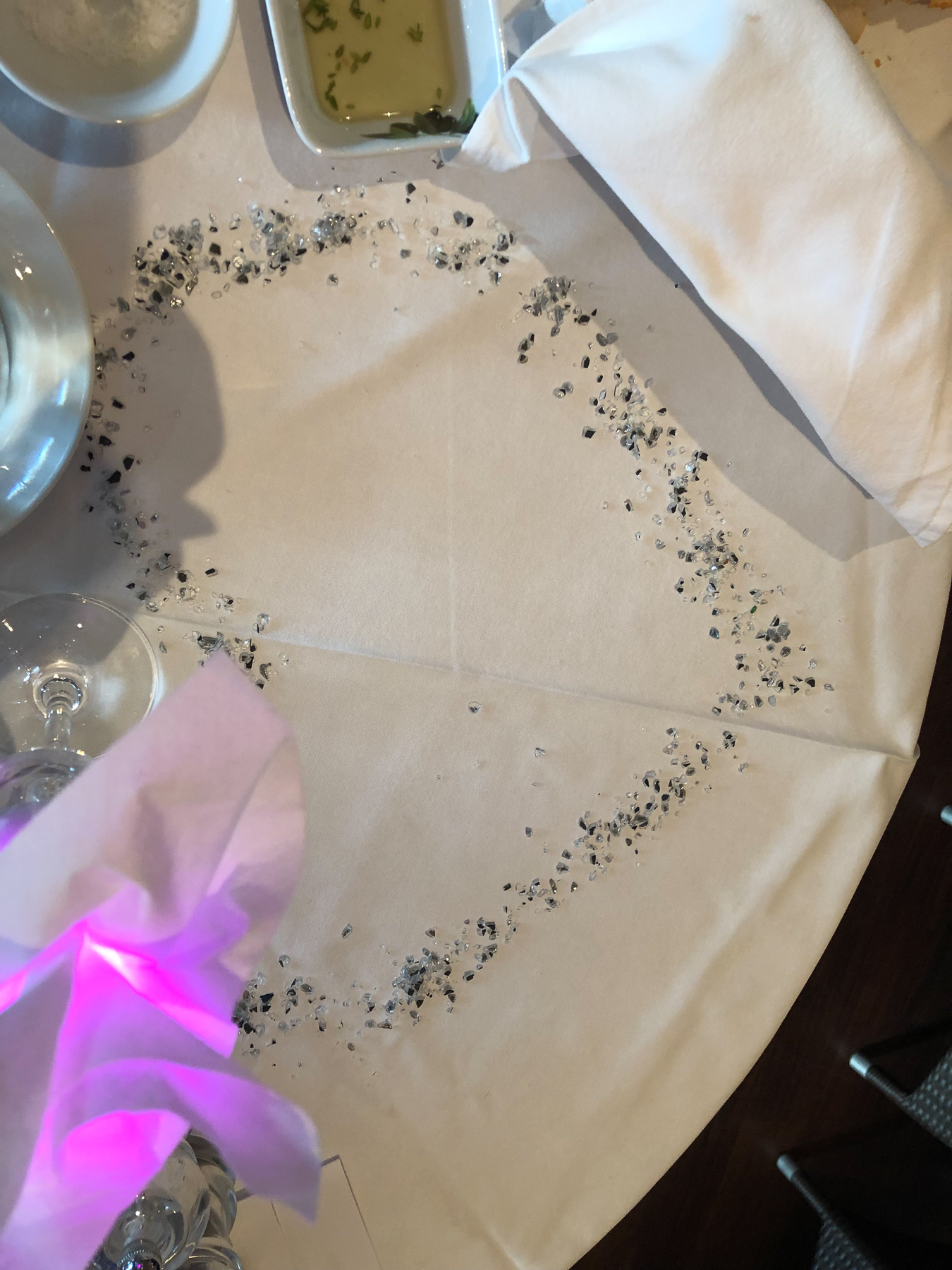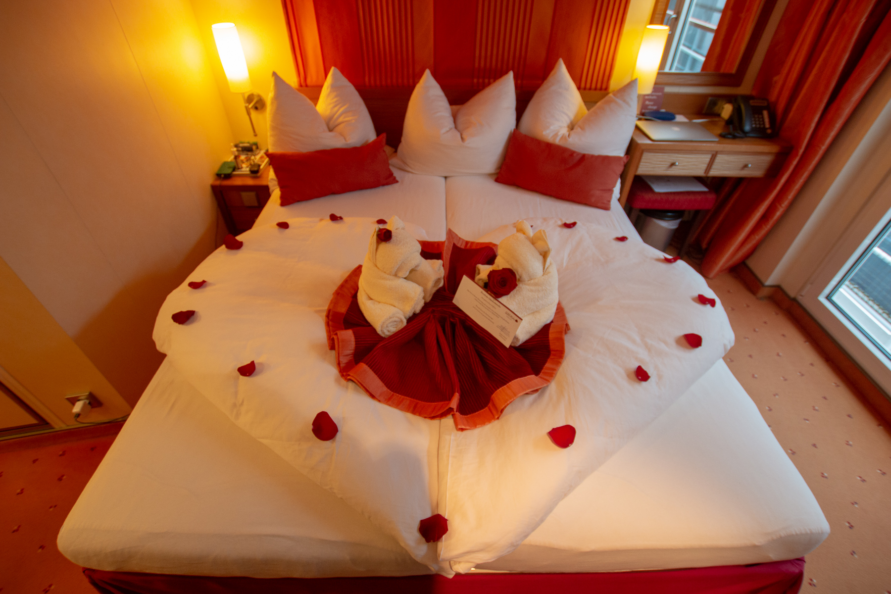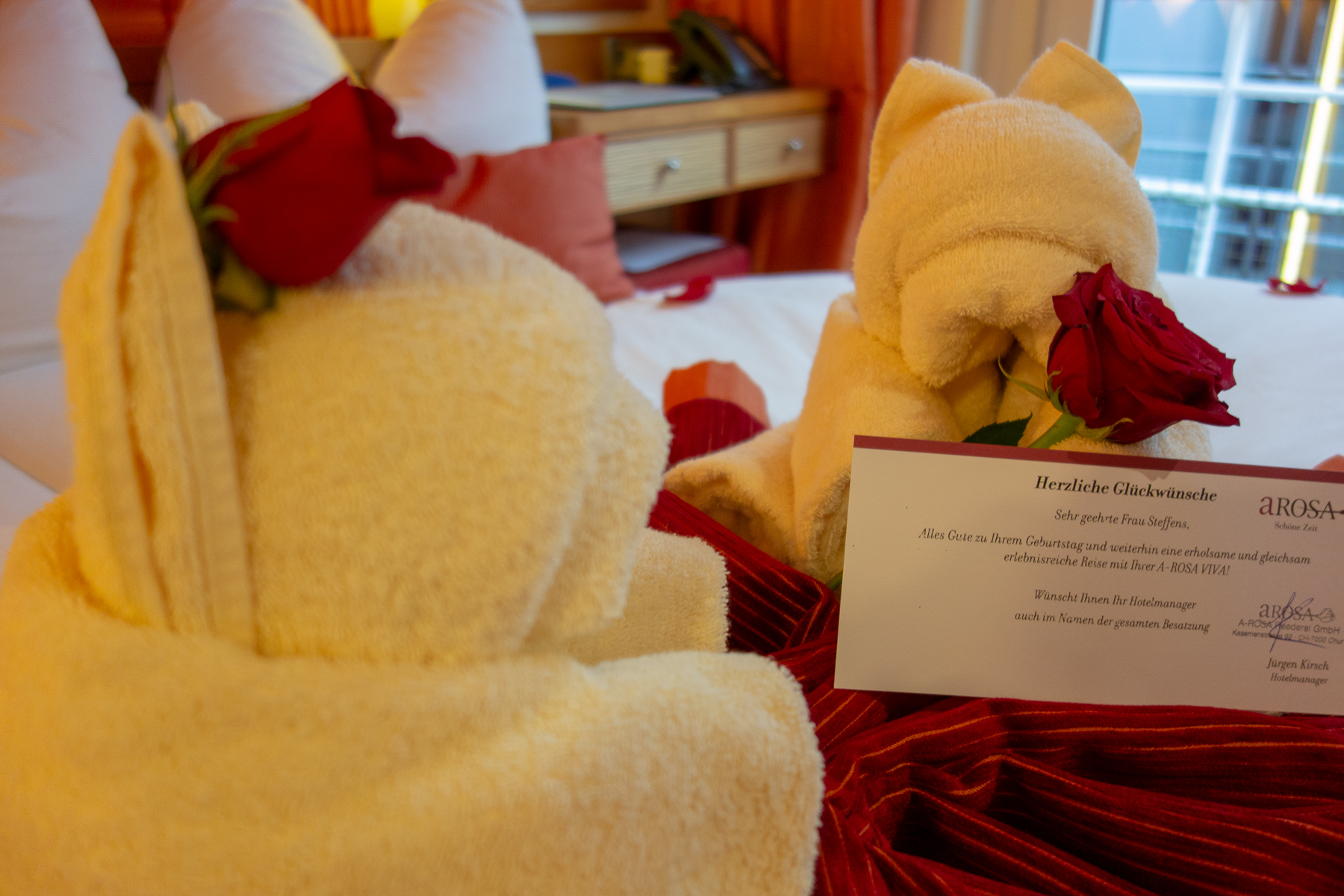 Nachdem meine Liebste nach drei Stunden Spa kaum noch wiederzuerkennen war, konnten wir uns für ein weiteres besonderes Dinner fein machen. Wie schon beim letzten Spezial-Dinner hat es sich auch diesmal der Chefkoch nicht nehmen lassen, ein mehrgängies Menü zu kreiren und selbst zuzubereiten. Ein passender Abschluss zu Andreas Geburtstag. Wir hatten diesmal ob des Anlasses einen Tisch für uns allein, der mit einem großen Herzen aus kleinen Steinchen geschmückt war. Die Kabine war, das sei nur kurz eingeschoben, natürlich auch wieder besonders dekoriert worden. Zwei aus Handtüchern geformte Bärchen auf einem aus den Bettdecken geformten Herzen, dass Ganze mit Rosenblättern dekoriert. Als besonderen Clou hatte einer der Bärchen eine Rose hinters Ohr gesteckt. Echt knuffig. Zurück zum Essen. Der Maître und seine Kellnerinnen und Kellner gaben wieder einmal alles, damit es uns richtig gut ging. Insbesondere Katharina, die wir schon länger ins Herz geschlossen haben, glänzte wieder durch ihre ausgezeichnete Schule. Wir wurden einfach perfekt bedient. 1+ mit Sternchen. Robert (der Maître), gab wieder alles. Ein echter Entertainer, der eine Weinvorstellung in eine kurzweilige, abendfüllende Veranstaltung verwandeln kann. Der Chefkoch als dritter im Bunde tat sein übriges, um den Abend perfekt zu gestalten. Andrea mag keinen Oktopus und den gab es als Bestandteil einer Vorspeise. Kurzerhand wurde noch schnell ein ‘Hähnchen geschlachtet, denn es kommt ja alles frisch auf den Tisch’ und davon etwas Brust angebraten und statt des Oktopus mit Salat serviert. Alles ohne oder mit kaum spürbarer Verzögerung. Wir waren rundum zufrieden und ließen den Tag mit Calvados und Cocktail(s) ausklingen.