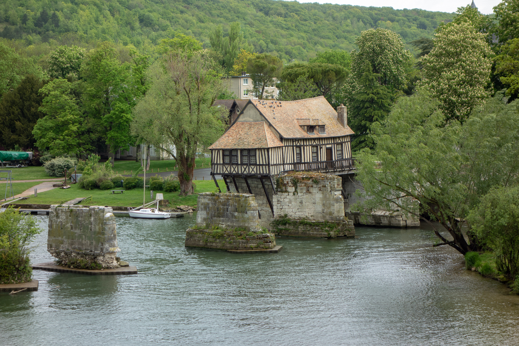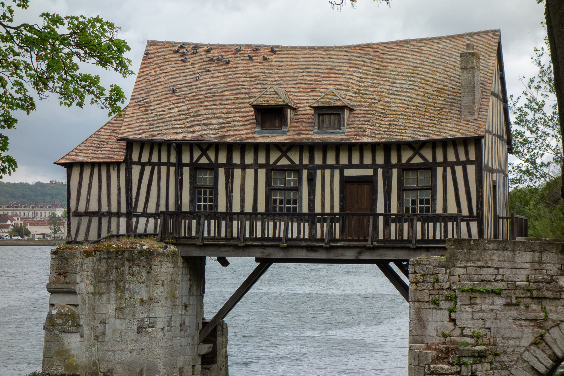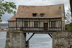 Also erst einmal über die Seinebrücke zur alten Mühle. Im wahrsten Sinne des Wortes, denn sie wird Le Vieux Moulin genannt. Ein altes Fachwerkhaus, dass im 16. Jahrhundert als Ersatz für einen Bau aus dem 12 Jh. auf einer Brücke zwischen zwei Brückenpfeilern errichtet wurde. Die Brücke hat den Krieg nicht überstanden. Von ihr sind nur noch Ruinen zu sehen, heißt: Es stehen nur noch wenige ihrer Pfeiler. Doch die Mühle wurde nicht zerstört. Die alte Mühle diente übrigens, wie sollte es auch anders sein, samt Brücke Claude Monet als Vorlage für ein Bild.