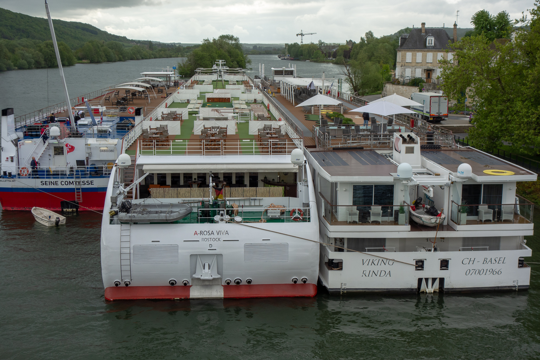 Nach unserem kurzen Ausflug an das rechte Seienufer ging es zurück über die Brücke in Richtung Altstadt. Natürlich nicht ohne ein Foto von unserem Schiff zu machen, dass heute Sandwichbelag spielen musste. Was das heißen soll? Nun, sowohl auf der Backbord- wie auch auf der Steuerbordseite lag jeweils ein weiteres Schiff auf gleicher höhe. Und da die Passagiere der Schiffe in 2. und 3. Reihe auch mal an Land möchte, liegen die Schiffe ganz dicht beieinander und sind über Gangways miteinander verbunden. Für uns in der Mitte hieß das übrigens: Alle Jalousien runter und Vorhänge zu, um keine allzutiefen Einblicke zu gewähren. Die beiden anderen Schiffe konnten wenigstens die uns abgewandte Seite offen lassen.