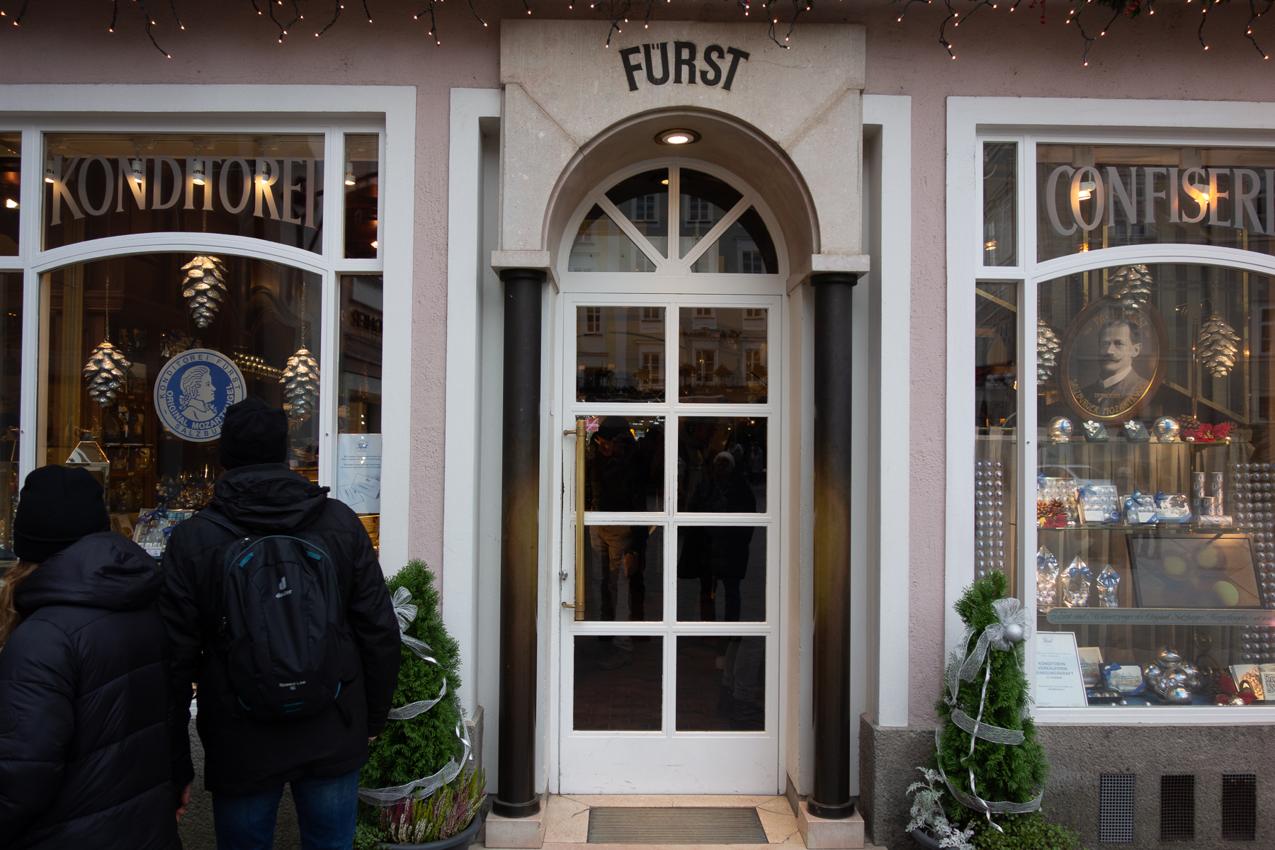 Nach Ende der Stadtführung löst sich die Gruppe auf und jeder hat knapp zwei Stunden zur freien Verfügung. Wir suchen erst einmal ein Café auf, um uns von innen und außen aufzuwärmen. Nach zwei Wiener Melange und einem Stück leckerem Kuchen geht es direkt rüber zur Konditorei Fürst, die gleich gegenüber liegt. Nur diese Konditorei stellt Mozartkugeln nach dem Originalrezept her. Alle anderen Hersteller von Mozartkugeln, auch Salzburger, tun das nicht, da sie es nicht dürfen. Nur der Name darf verwendet werden, da er früher durch die Familie Fürst nicht geschützt wurde. Hier wird erst einmal eine gewisse Anzahl an Kugeln erworben, und ein dickes Säckchen Taler wechselt den Besitzer. Nun endlich können wir den Weihnachtsmarkt zu erobern.
