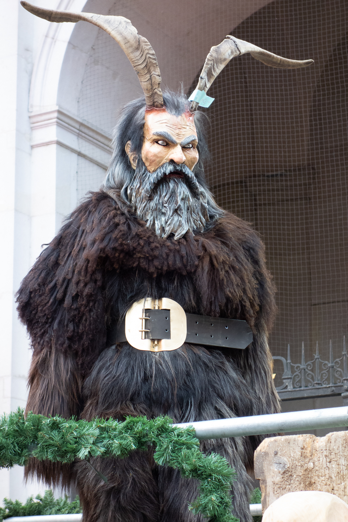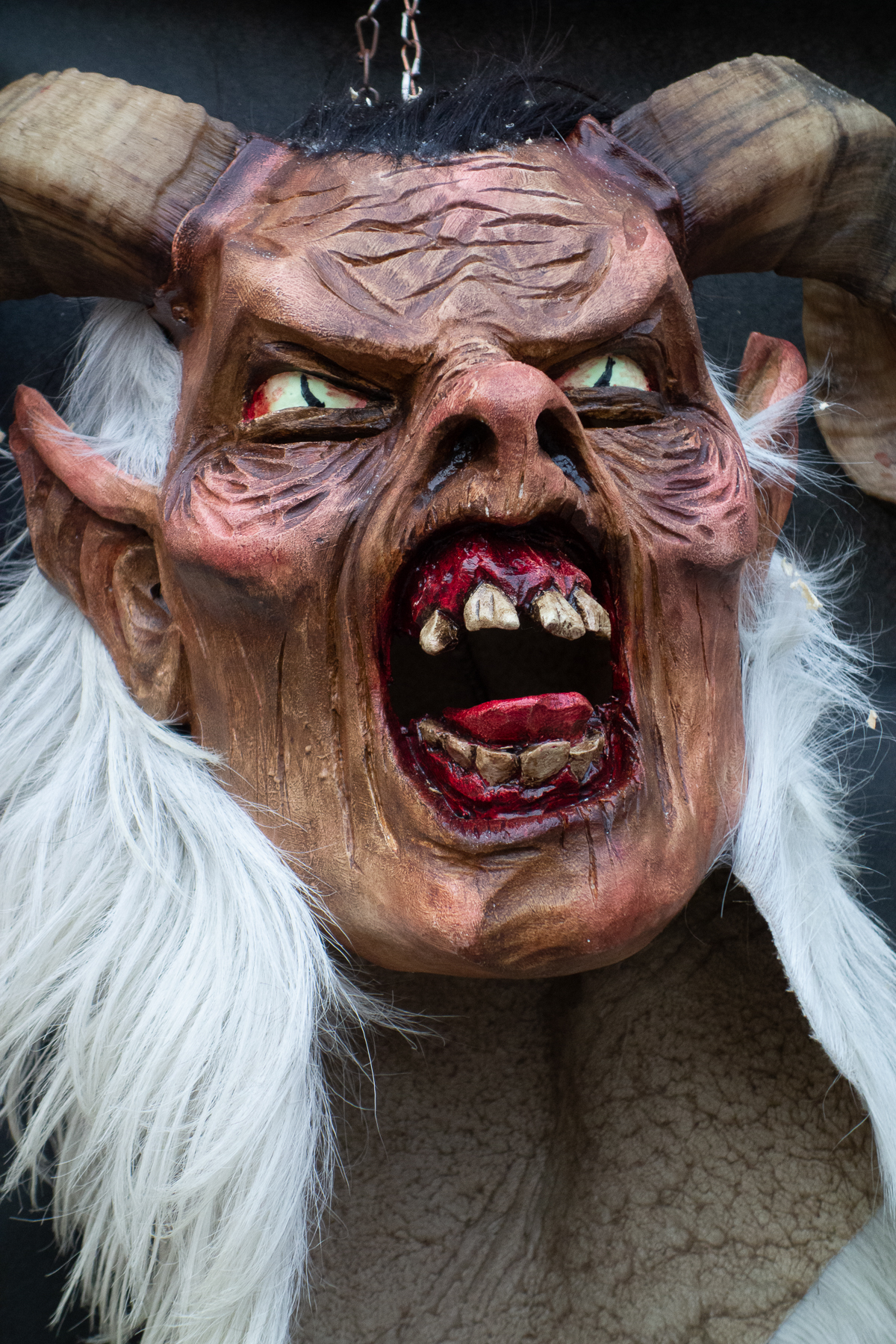 Noch ein Wort zu den Masken und den Typen auf dem Eishockeyfeld. Es handelt sich dabei um Crampusmasken und die Typen heißen folgerichtig Crampusse. Dabei handelt es sich um die Verkörperung des Begleiters des Nikolaus, der bekanntermaßen für die Bestrafung der bösen Kinder zuständig ist. Als den Typen, die bei uns Knecht Ruprecht genannt werden. Hier gibt es den Brauch, dass sie am Vorabend zum Nikolaustag nach einem Zug, der unseren Karnelvalszügen gleicht, “losgelassen” werden. Dann jagen sie alles, was nicht bei drei auf den Bäumen ist. Besonders gerne Frauen. Dabei kann man sich als Zuschauer wohl leicht den einen oder anderen Hieb mit einer Weidenroute einfangen. Diese Umzüge finden in jedem Dorf statt, so auch in Abtenau. Unsere Reiseleiterin empfiehlt uns daher, nach dem Umzug, der noch friedlich verläuft, besser das Hotel aufzusuchen. Da das Wetter mittlerweile äußerst mies ist, es schneeregnet, entschließen wir uns, dem Spektakel fern zu bleiben bzw. es aus der Ferne zu beobachten. Und was für ein Glück, einige Wagen stellen sich, ähnlich wie beim Rosenmontagszug, direkt vor unserem Hotel auf. Musik von Rammstein und ähnlichen Bands hallt durch die Räume, begleitet von blechern klingenden Kuhglocken. Diese sind das einzige Warnsignal, dass die Jagdopfer zu hören bekommen, bevor der Crampus zuschlägt.