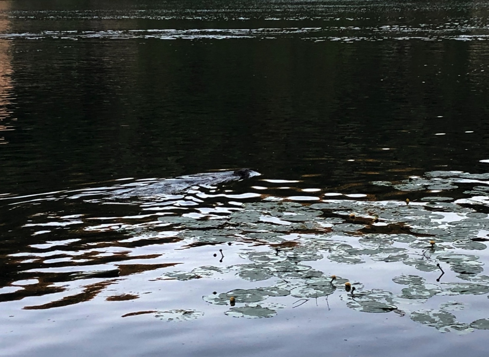 Flucht auf’s freie Wasser und so bleibt nur das etwas undeutliche Foto eines davonschwimmenden Nutria.
