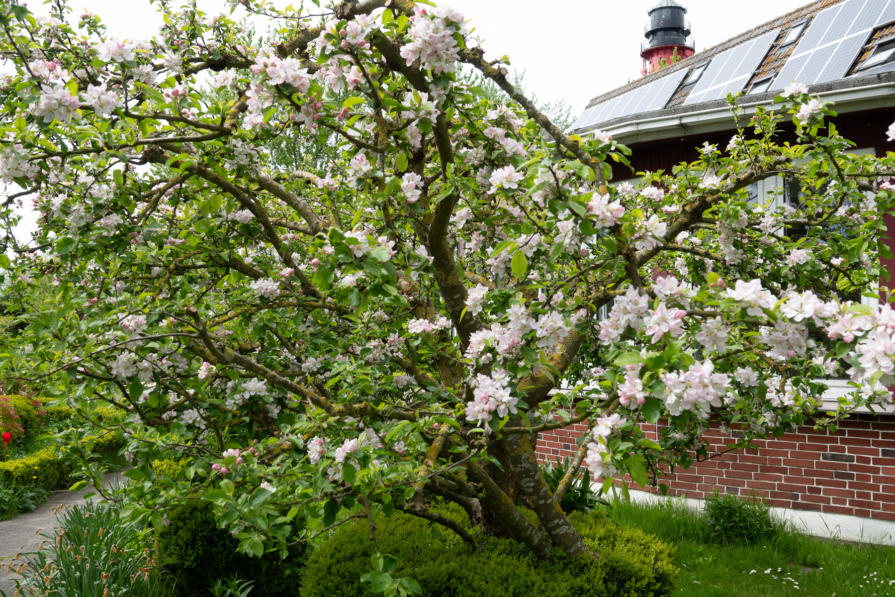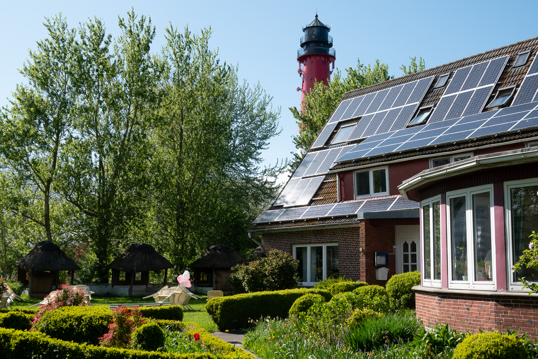 Die Überfahrt selbst ist wenig spektakulär. Nach etwa 45 Minuten ist der Tiefwasseranleger Pellworm erreicht. Von dort ist es nicht weit zu unserer Unterkunft, dem Landhaus Leuchtfeuer. Besagtes Landhaus ist ein Hotel Garni,liegt direkt hinterm Deich und wird, die Welt ist klein, von einem Kölner Ehepaar betrieben. Der übliche Papierkram ist schnell erledigt, unser Zimmer wartet schließlich bereits. Das Zimmer entpuppt sich eher als Wohnzimmer und das dazugehörige Bad ist größer als so manches Hotelzimmer mit Bad. Wir sind es sehr zufrieden, zumal wir ebenerdig wohnen und den Ausblick in den Garten genießen können. Was aber gleich auffällt: Die Friesen mögen es kühler. Auch wenn sie aus Köln stammen.