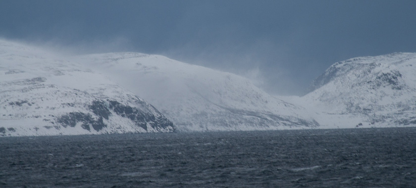 Was für ein Start in den Tag. Ich werde wach, schau aus dem Fenster und möchte mich am liebsten gleich wieder hinlegen. Nebel und Schnee! Dazu ein Wind, der einem den gepriesenen Zauber der Arktis schnell und nachhaltig aus den Rippen bläst. Also erst einmal frühstücken, diesmal kein Fisch! Dann raus auf’s Deck und die Tristesse einfangen. Da mich auch wieder mein Rücken plagt und die Fahrt derzeit aber auch gar nichts zu bieten hat, beschließe ich, mich noch ein Weilchen auf das harte Sofa…